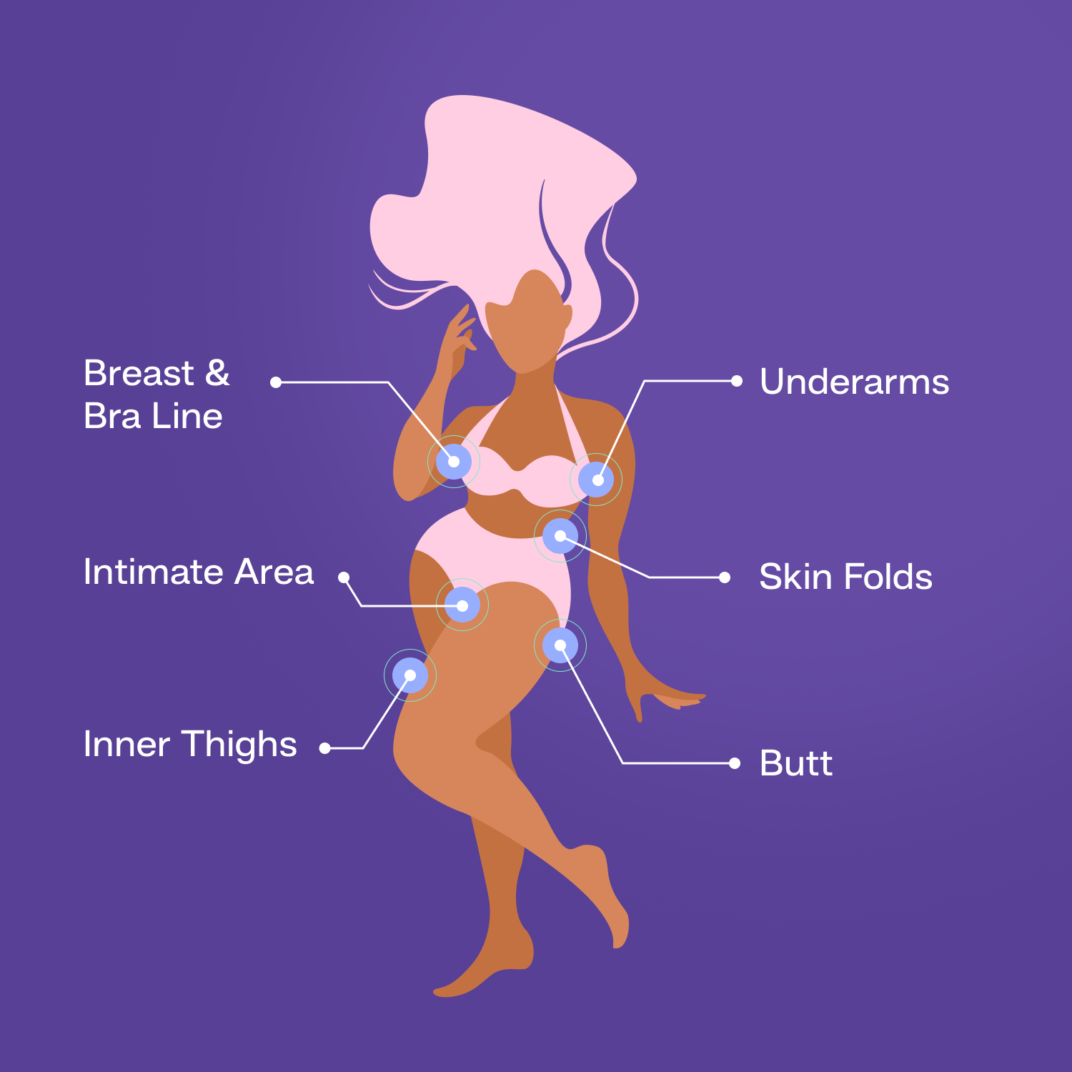 Apply lotion to fingers and apply evenly on breasts, upper inner thighs, or buttocks. Evenly spread lotion to an area. If need apply to any missed or high contact areas, then let dry before dressing. Throughly rinse your hands to remove any drying powder from your fingers or palm.